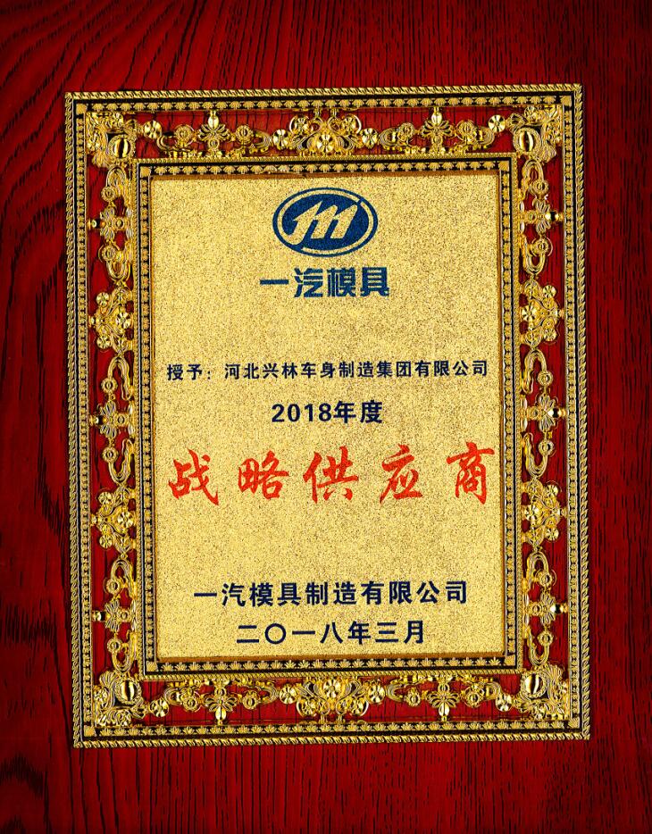 3月29日一汽模具制造有限公司2018年度供應(yīng)鏈大會在吉林長春召開!會上,河北興林車身制造集團(tuán)有限公司憑借優(yōu)異的產(chǎn)品質(zhì)量,被授予2018年度“戰(zhàn)略供應(yīng)商”!河北興林車身制造集團(tuán)有限公司 總經(jīng)理葛總出席會議并領(lǐng)獎!